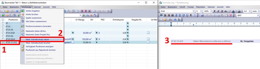 Markieren Sie eine oder mehrere Positionen und setzen Sie den Schreibschutz über den Menüpunkt Werkzeuge > „Mark. Schreibschutz setzen“.