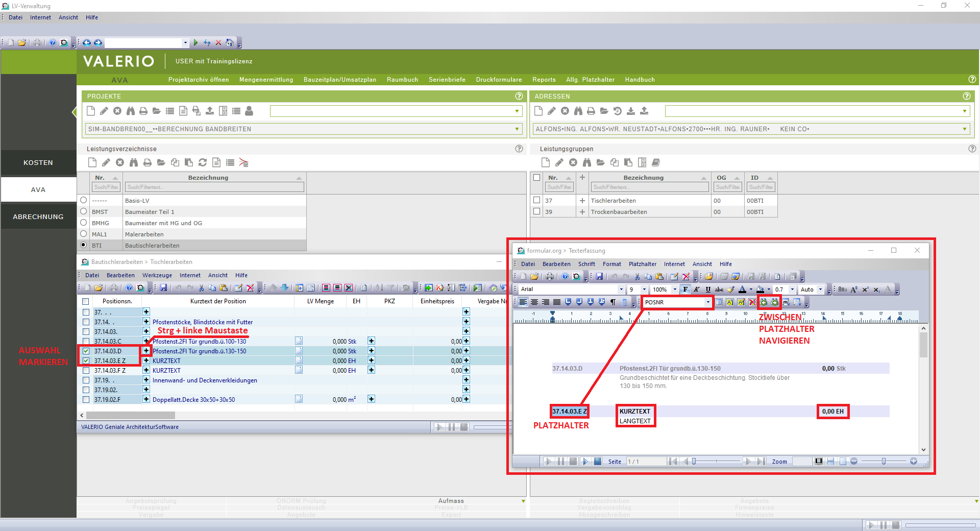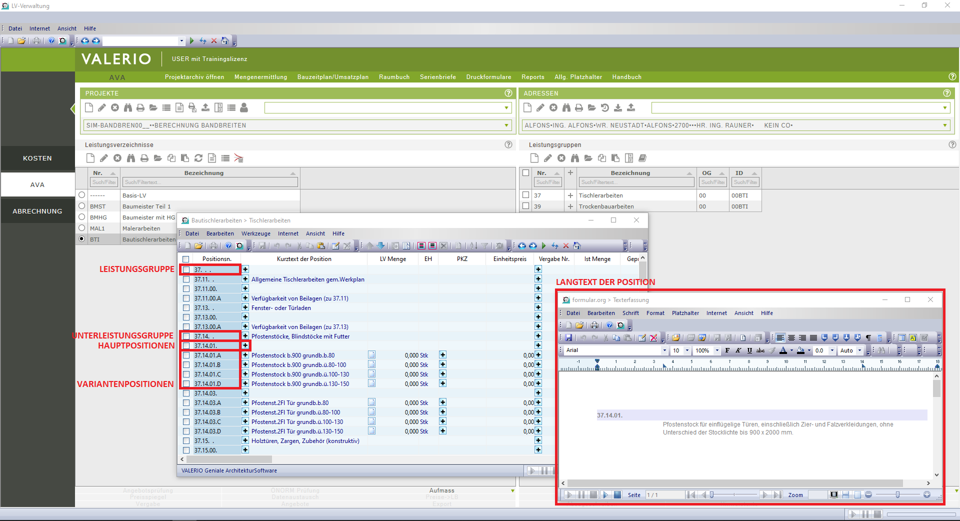 Positionen mit einem dunkelblauen Hintergrund sind die standardisierten Positionen, die nicht verändert werden dürfen. Die Positionen mit einem hellblauen Hintergrund und unbedingt erforderlichem Z Index am Ende sind die Projektpositionen, die individuell nur für das aktuelle Projekt erstellt wurden. Im Langtext-Fenster sind die Texte von Standardpositionen als schreibgeschützte ausgegraut, währenddessen die Texte von Projektpositionen in Schwarz dargestellt werden und mit einem Mausklick ausgewählt und bearbeitet werden können.