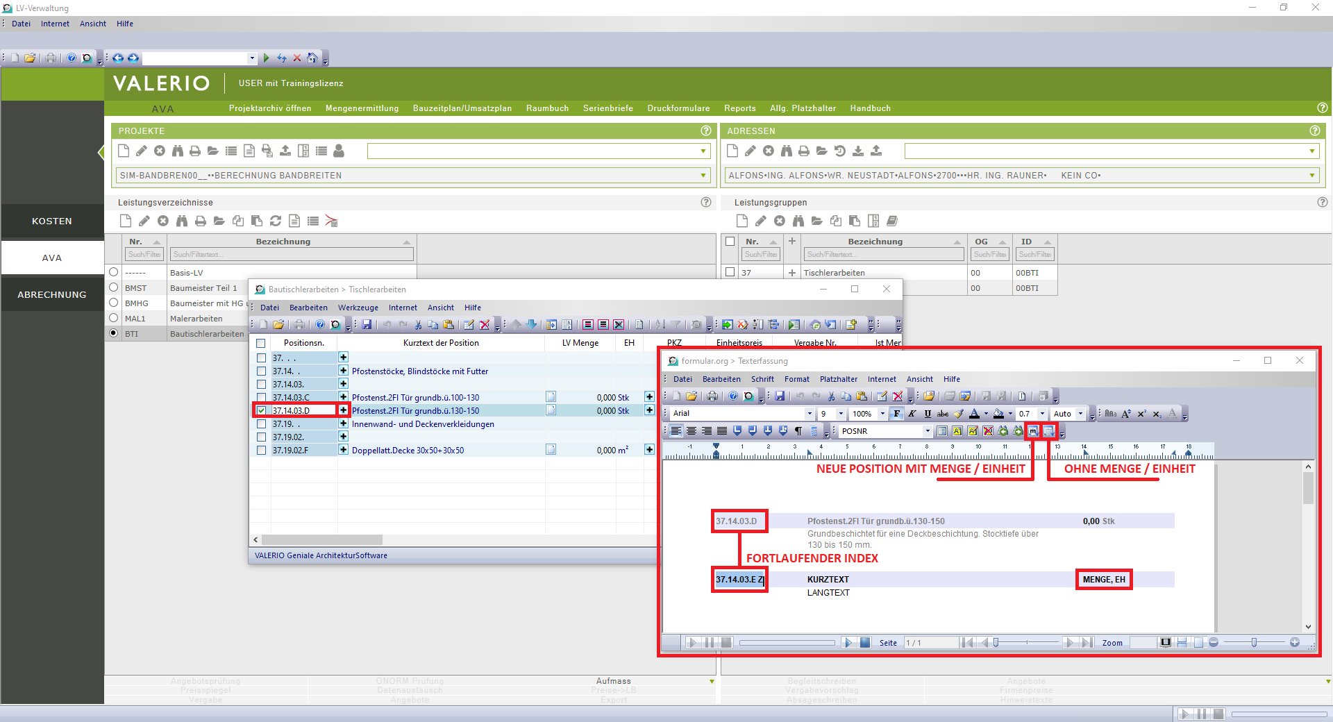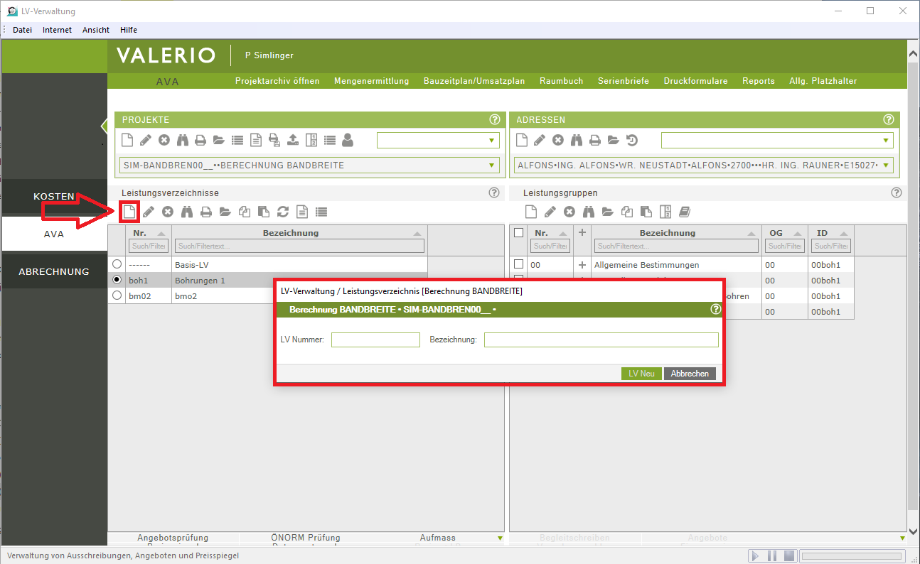 Tipp: Die LV-Nummer wird in Valerio zum Teil anderer Datensätze, daher wird es empfohlen die LV-Nummer als eine 3-4-stellige Abkürzung mit (optional) einer Nummer einzugeben. Beispielsweise Baumeisterarbeiten können als BMST01 oder Erdarbeiten als ERD kodiert werden.
