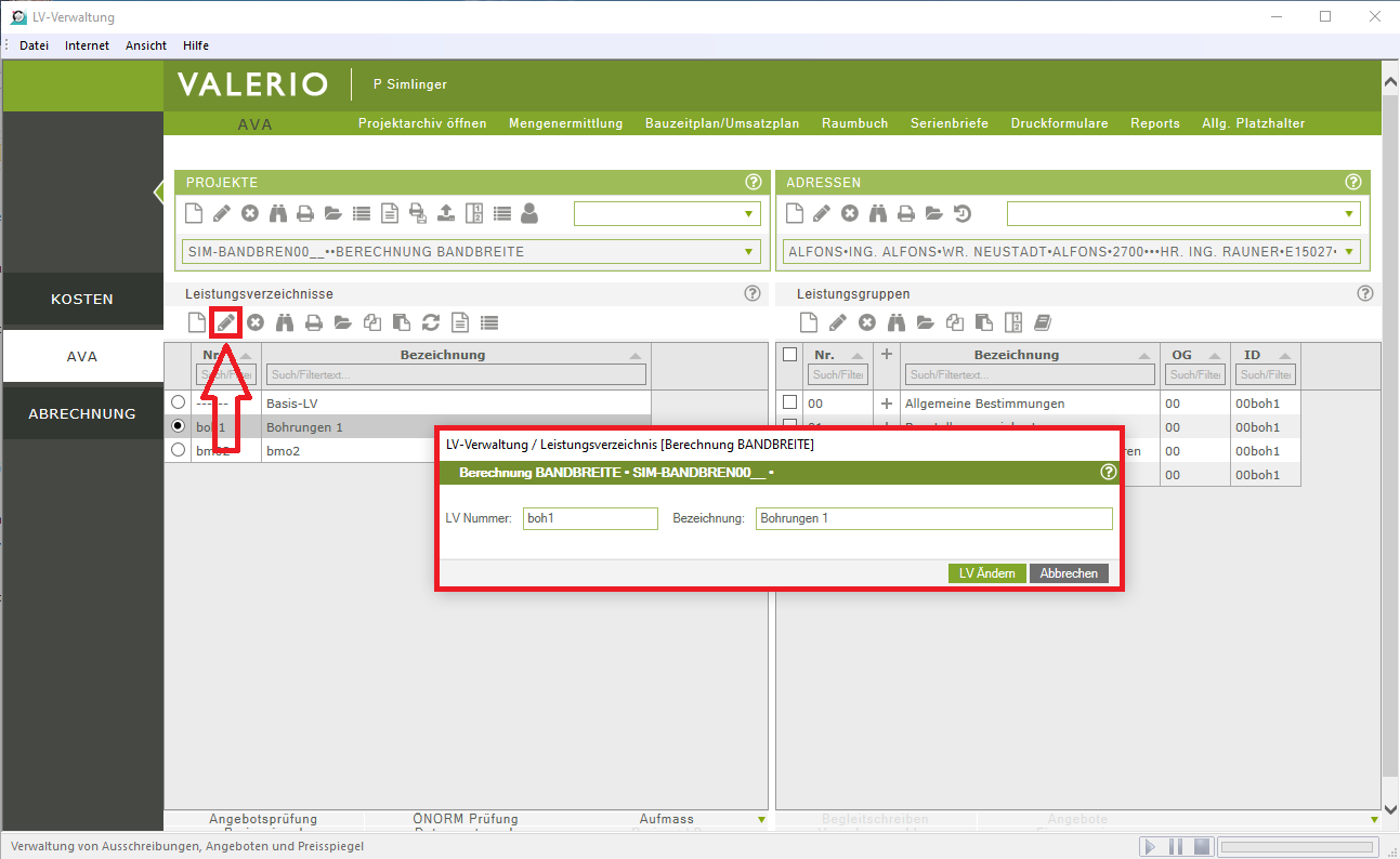 Die LV-Nr und die LV-Bezeichnung können Sie über das Symbol „Leistungsverzeichnis bearbeiten“ ändern.