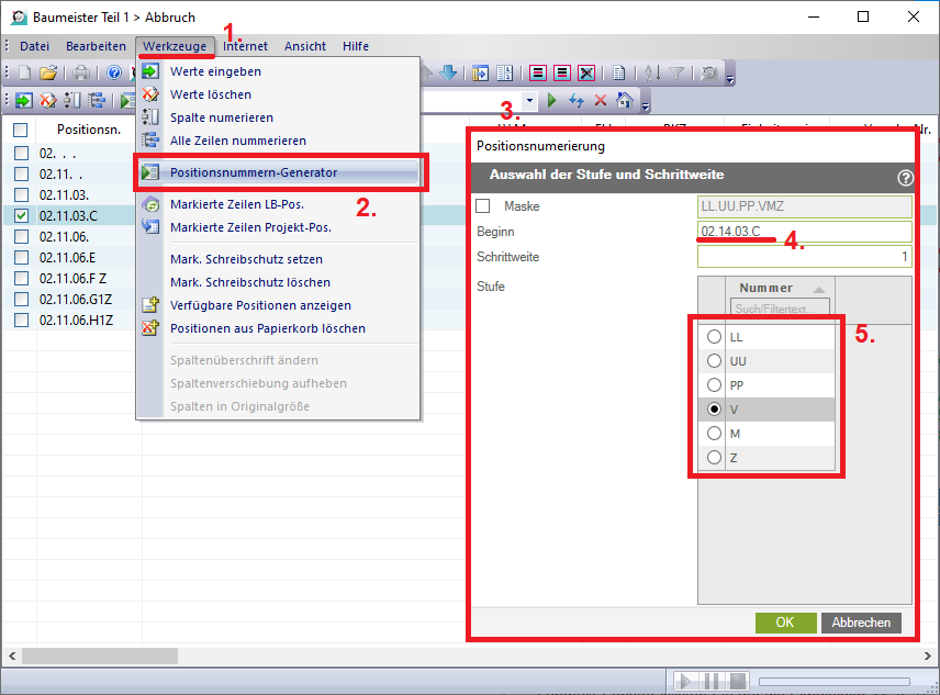 Stellen Sie nun im Positionnummerngenerator die Schrittweite, die Stelle, an der eingefügt werden soll und die Art/Tiefe (also Unterleistungsgruppe, Hauptposition, Variante bzw. Mehrfachverwendung und Zusatzposition ein. Fahren Sie dann fort und nun weiter beschrieben.