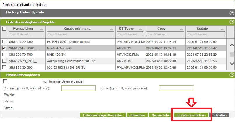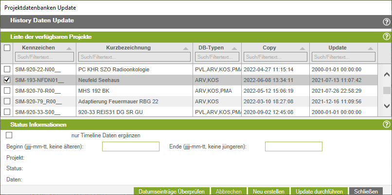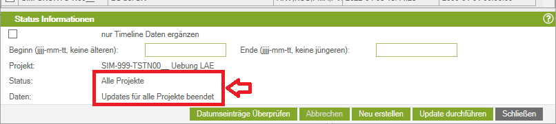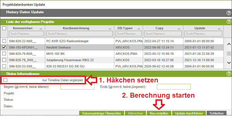 - Am Ende bekommen Sie im History-Berechnungsfenster die Auskunft in der Zeile Status „Alle Projekte“ und in der Zeile Daten „Updates für alle Projekte beendet“. Nun ist die Berechnung fertig und Sie können das Fenster zur History Berechnung schließen.