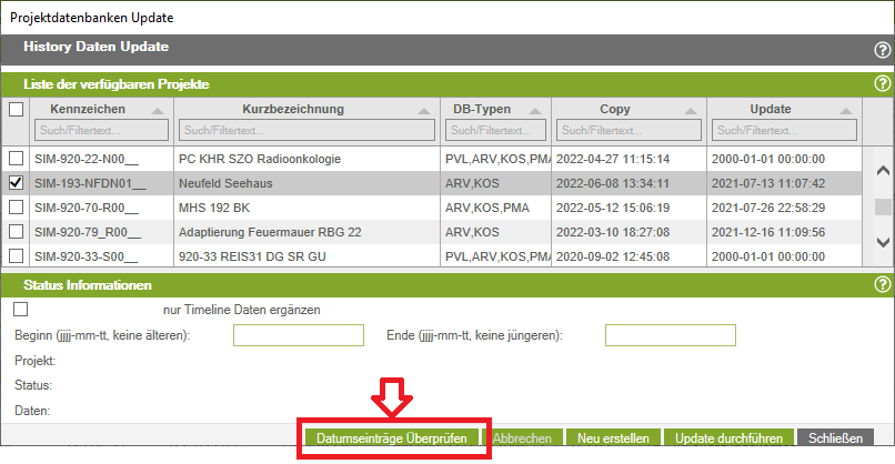 Wählen Sie in der Liste das Projekt aus, für das Sie die Datumeingaben überprüfen wollen.