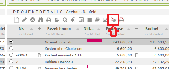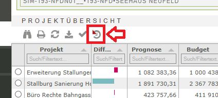 Die Berechnung der Projekt-History starten Sie vom Modul Kosten aus über das Symbol für die History-Berechnung