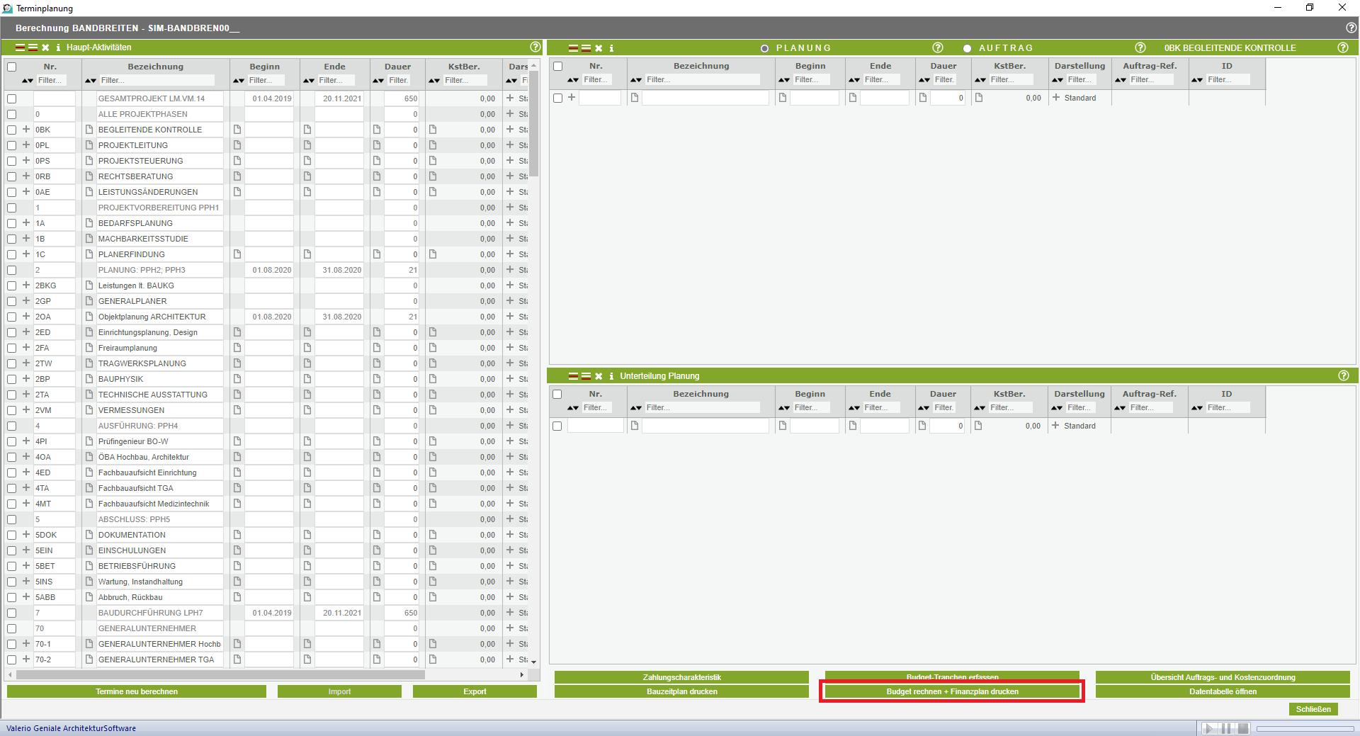 Sinnvollerweise gibt es dort bereits Daten, ansonsten machen Timelines aus diesem Modul natürlich nicht viel Sinn. Gehen Sie nun weiter zum Bereich „Budget rechnen + Finanzplan drucken“.