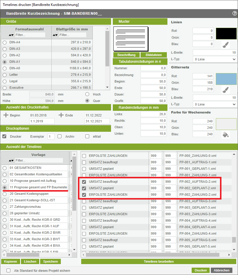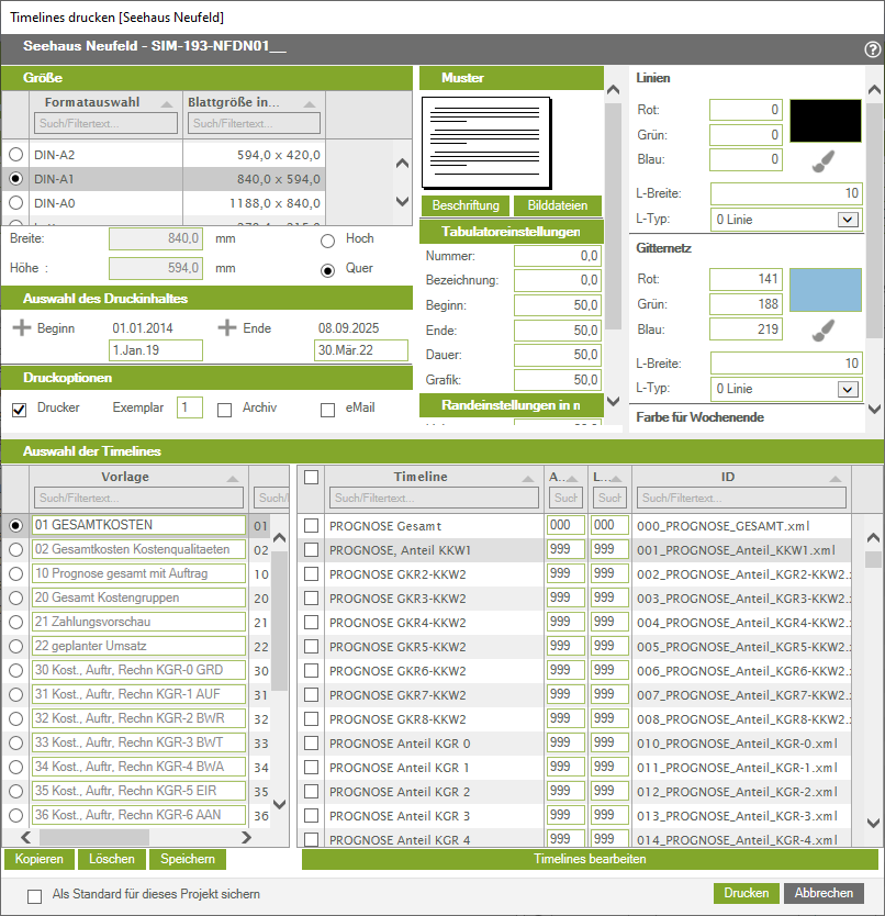 Im oberen bzw. mittleren Teil des Dialogfenster zum Druck von Timelines finden Sie Einstellmöglichkeiten für das Drucklayout. Wir Empfehlen beim Papierformat das Format DIN-A1 zu wählen. Wichtig ist, dass Sie den Zeitraum des Druckinhaltes sinnvoll für Ihr Projekt wählen und eingeben!