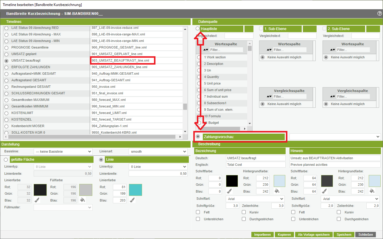In der rechten oberen Hälfte werden die Datenwerte festgelegt, welche die Timeline abbilden soll.