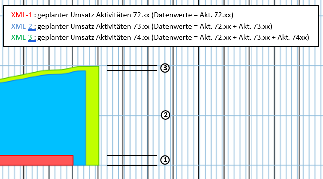 Dazu werden die Timeline zunächst mit Daten befüllt. Bei der Erstellung der Timeline für die Umsätze der Aktivitäten 72.xx werden bei der Filterung alle 72.xx Aktivitäten angeklickt. Bei der Erstellung der Timeline für die Umsätze der Aktivitäten 73.xx werden bei der Filterung alle 73.xx UND alle 72.xx Aktivitäten angeklickt. Und für die Umsätze der Aktivitätem 74.xs werden bei der Filterung alle 74.x, alle 73.xx und alle 72.xx Aktivitätem angeklickt.