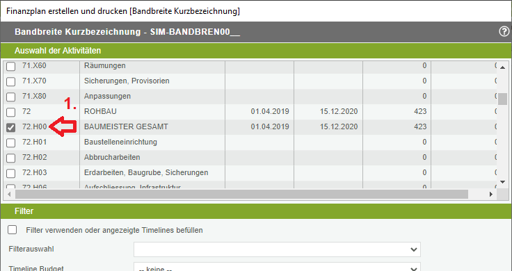 Im folgenden Beispiel sollen nur die Baumeisteraktivitäten berücksichtigt werden. Dazu werden ím 1. Schritt zuerst alle Aktivitäten abgewählt und nur die Aktivität „72.H00 Baumeister Gesamt“ ausgewählt.