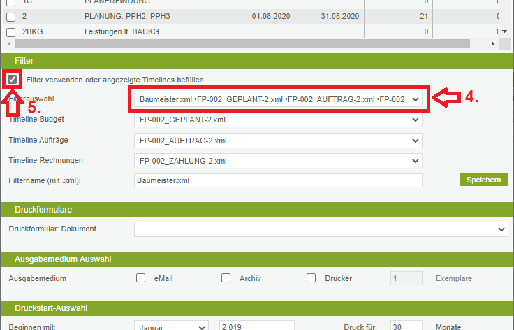 Zur Ausgabe der Timelines gehen Sie bitte zum Modul Kosten und wählen Sie Ausdruck der Timelines (vgl. oberhalb Timelines ausgeben).
