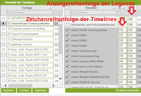 Bei Aufbau der Timeline-Grafik werden die ausgewählten Timelines eine nach der anderen gezeichnet. In der Spalte „Anzeige“ neben der jeweiligen Timeline kann angegeben werden, in welcher Reihenfolge die Timelines gezeichnet und übereinander gelegt werden, also welche Timelines im Überschneidungsfall andere überdecken.