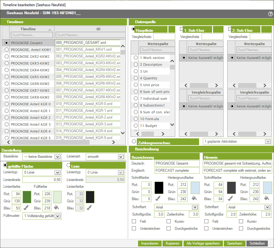 Beim Bearbeiten der Timelines kann man sehen (festlegen), ob eine Timeline Daten aus den Datenbanken der History Berechnung heranzieht oder ob es sich um eine PMA Timeline handelt. Im Bereich rechts ist die Datenquelle dementsprechend entweder mit „Hauptliste“ (bwz. „1. Sub-Ebene“ oder „2. Subebene“)=Daten aus der History Berechnung; oder mit „Zahlungsvorschau“ = PMA Timeline mit Daten aus der Terminplanung; ausgewählt.