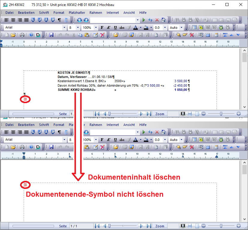 Um ein Rechendokument zu löschen, öffnen Sie dieses und löschen Sie alles (!) aus dem Rechendokument heraus (auch alle leeren Zeilen!), bis auf das rote Dokumentenendesymbol ganz am Ende (vgl. Screenshot unterhalb).