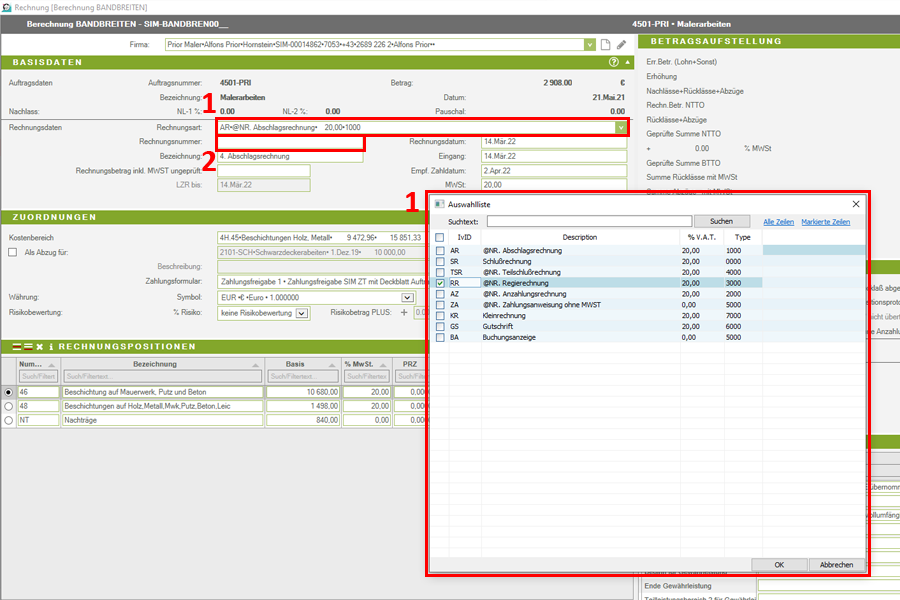 Das Anlegen von Vorauszahlungsrechnungen erfolgt nach den selben Regeln wie das Anlegen von Abschlagsrechnungen, Regierechnungen und Schlussrechnungen.
