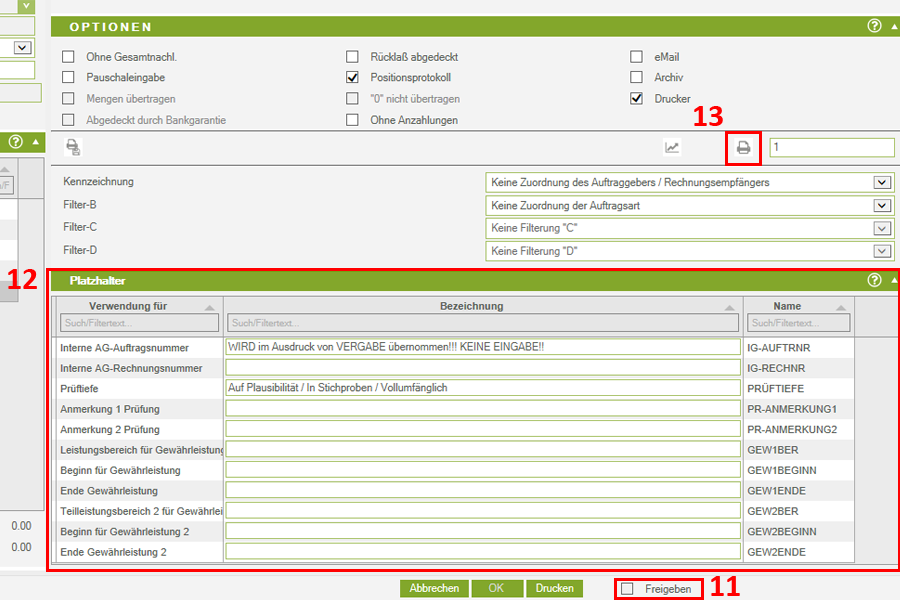 Im Bereich „Platzhalter“ rechts unten im Fenster der Rechnungserfassung können Sie noch einige Angaben zur Rechnung erfassen, die dann auf dem Ausdruck ausgegeben werden.