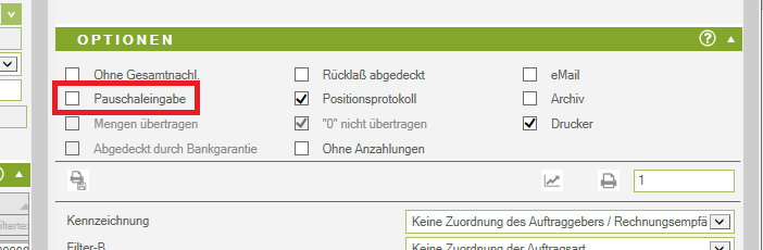 Ist das Häkchen „Pauschaleingabe“ gesetzt, können Sie eine vom Aufmaß unabhängige Summe eingeben. Das ermöglicht auch für die Erfassung von fehlerhaften Rechnungen mit nicht übereinstimmenden Aufmaßen und Summen, um z.B. ein Projekt bzw. einen Projektverlauf nachträglich abzubilden.