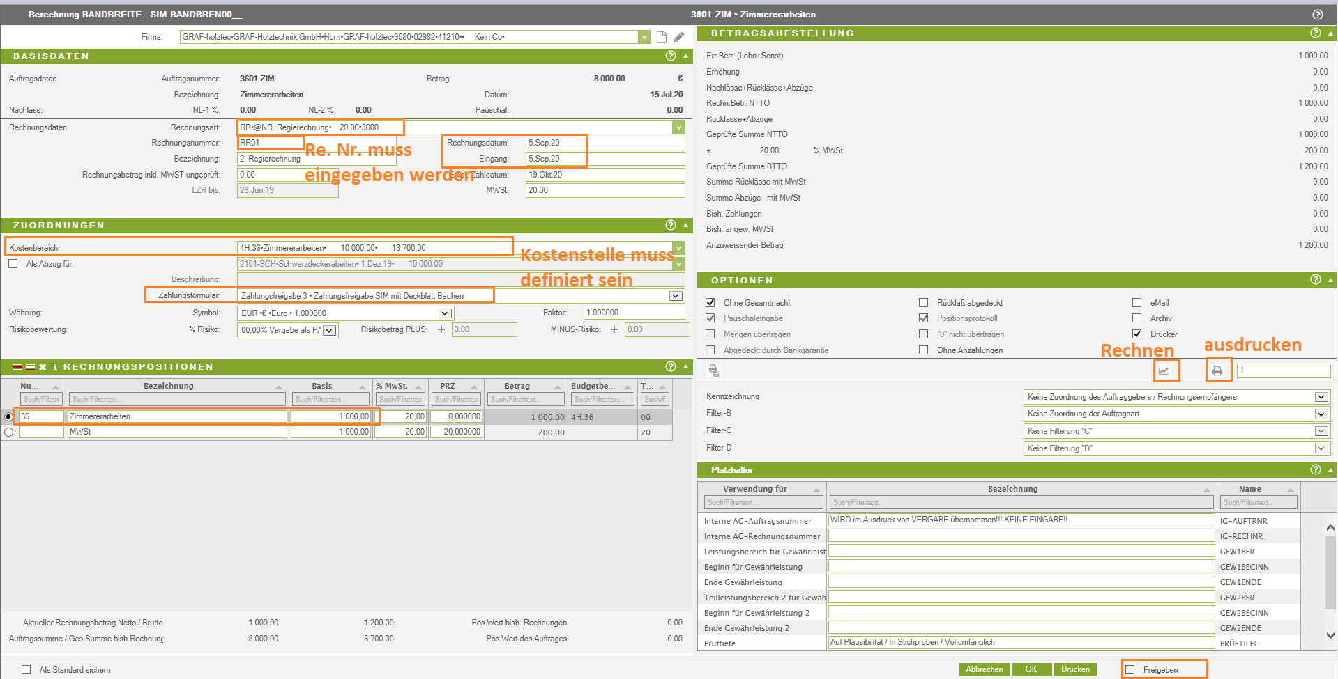 Tipp: Sie können die erfassten Rechnungen noch unabhängig von den Rechnungsnummern der ausführenden Firmen durchnummerieren indem Sie die zusätzliche Auftraggeber-Rechnungsnummer in das Eingabefeld AG-Rechnungsnummer eingeben.