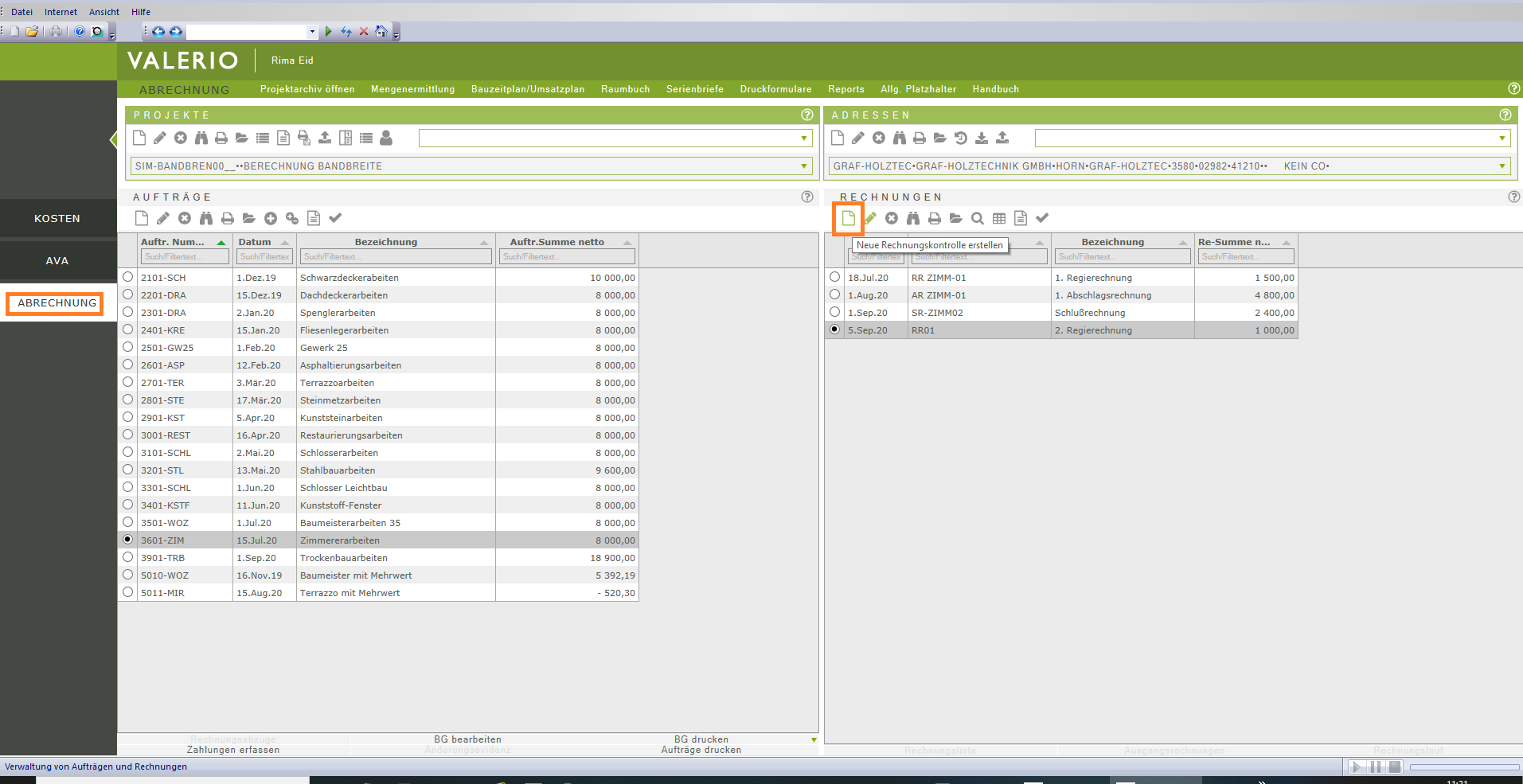 Um eine Rechnung in Valerio zu erfassen, gehen Sie in das Modul Abrechnung, wählen Sie im linken Bereich den der Rechnung zu Grunde liegenden Auftrag aus und Klicken Sie in der Menüzeile rechts oben auf „neue Rechnungskontrolle erstellen“.