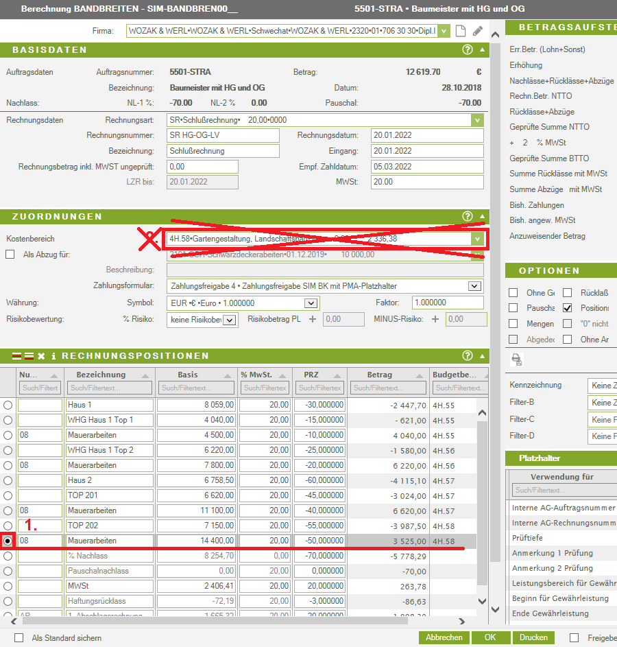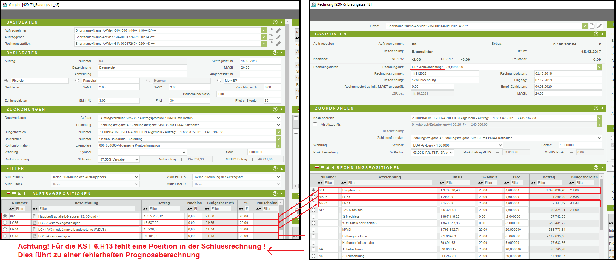 Bei Aufträgen, die auf mehrere Kostenstellen aufgeteilt sind, ist unbedingt zu beachten, dass in der Schlussrechnung für jede Kostenstelle, die im Auftrag einer Auftragsposition zugeordnet wurde, auch eine Position in der Schlussrechnung vorhanden ist bzw. eingetragen wird. Selbst wenn in einer Auftragsposition keine Leistung erbracht wurde, so ist die Position in der Schlussrechnung anzuführen und eben mit dem Betrag 0 zu versehen. Geschieht dies nicht, wird die Berechnung der Prognose verfälscht, weil für nicht schlussgerechnete Kostenstellen eines Auftrags weiterhin der Auftragsbetrag in dieser Kostenstelle in die Prognose einfliesst (Vgl. Kapitel Arbeitsweise und Nachvollziehbarkeit der Berechnung der Prognose).