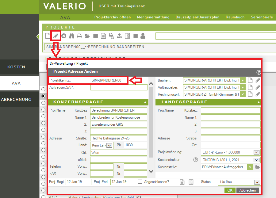 Die Vorlagen für die Rechendokumente befinden sich alle in folgendem Verzeichnis: „[Valerio]\DEFAULTS\“ und haben die Datei-Endung .VTX. Um projektspezifische Vorlagen verwenden zu können, erstellen Sie einen Unterordner im Verzeichnis DEFAULTS und verwenden Sie als Ordner-Name das Projekt-Kennzeichen. Sie finden das Projektkennzeichen z.B. indem Sie in der Projektmenüzeile links oben auf das Symbol für „bestehendes Projekt Basisdaten ändern“ klicken. In dem Fenster mit den Projektbasisdaten steht das Projektkennzeichen links oben.