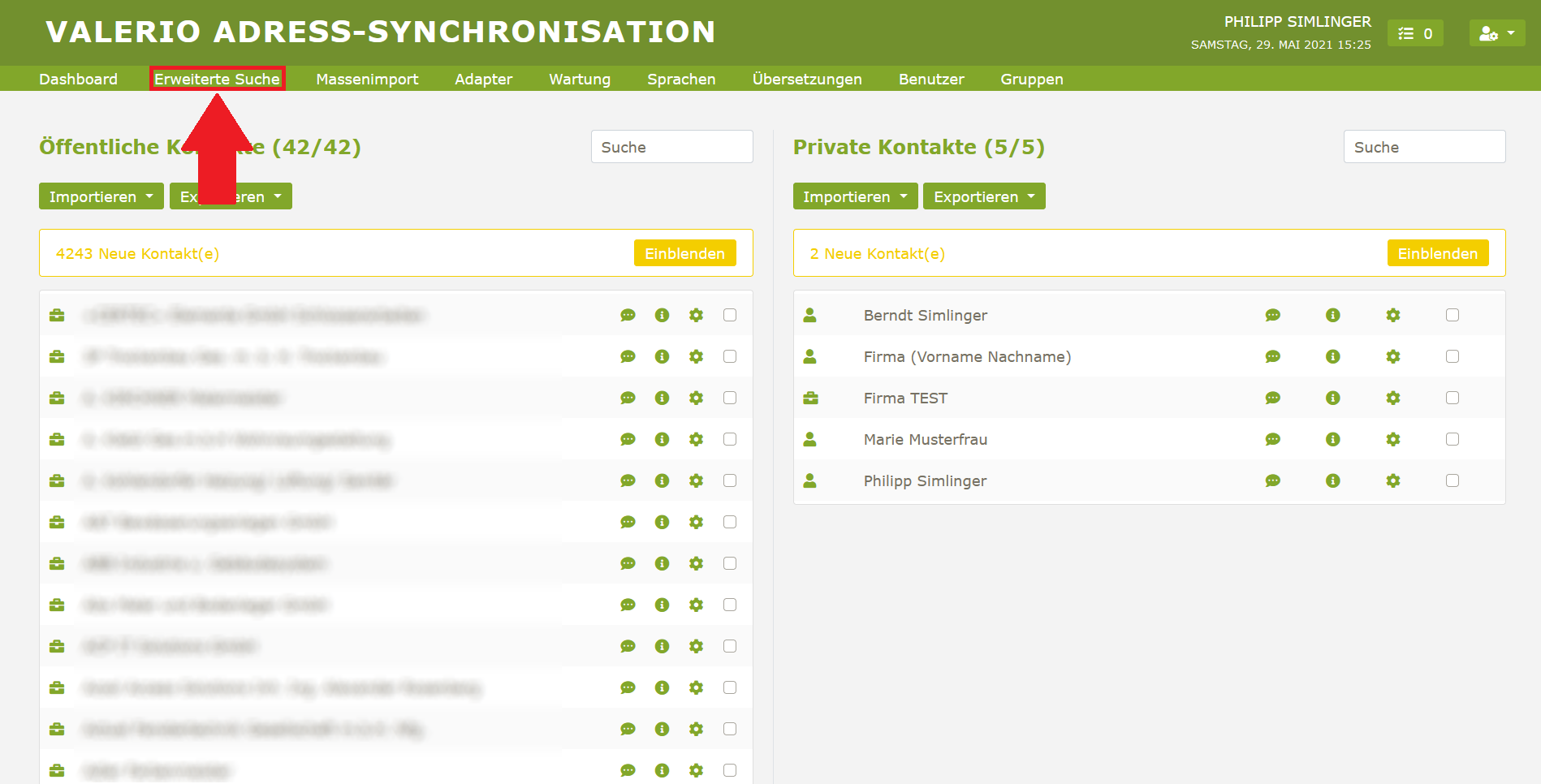 Wollen Sie ausgeblendete Kontakte suchen oder Ihre gesamte Datenbank (privat oder öffentlich) durchsuchen, müssen Sie dies im Bereich 1 auswählen.