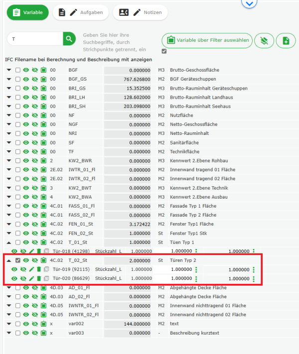 Liste der Variablen nach der Übertragung der Mengen aus den IFC-Attributen